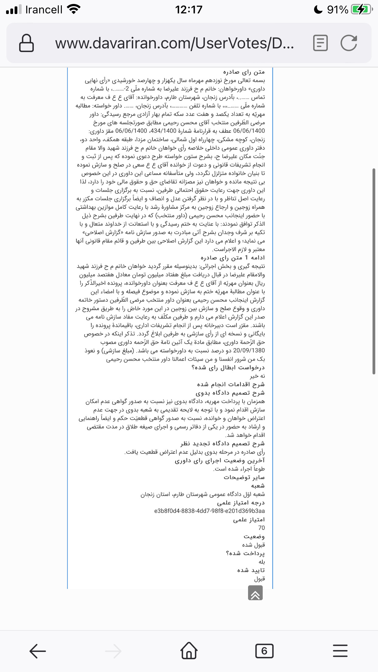 - خلاصه رأی خواهان خانم م ح فرزند شهید والا مقام جنّت مکان علیرضا ح ، بشرح ستون خواسته طرح دعوی نموده که پس از ثبت و انجام تشریفات قانونی و دعوت از خوانده آقای ع ع سعی در صلح و سازش نموده تا بنیان خانواده متزلزل نگردد، ولی متأسفانه مساعی این داوری در این خصوص بی نتیجه مانده و خواهان نیز مصرّانه تقاضای حق و حقوق مالی خود را دارد، لذا این داوری جهت رعایت حقوق احتمالی طرفین، نسبت به برگزاری جلسات و رعایت اصل تناظر و با در نظر گرفتن عدل و انصاف و ایضاً برگزاری جلسات مکرّر به همراه زوجین و ارجاع زوجین به مرکز مشاورۀ رشد با رعایت کامل موازین بهداشتی با حضور اینجانب محسن رحیمی (داور منتخب) که در نهایت طرفین بشرح ذیل الذکر توافق نمودند: با عنایت به ختم رسیدگی و با استعانت از خداوند متعال و با تکیه بر شرف وجدان بشرح آتی مبادرت به صدور سازش نامه «گزارش اصلاحی» می نماید؛ و اعلام می دارد این گزارش اصلاحی بین طرفین و قائم مقام قانونی آنها معتبر و لازم الاجراست.