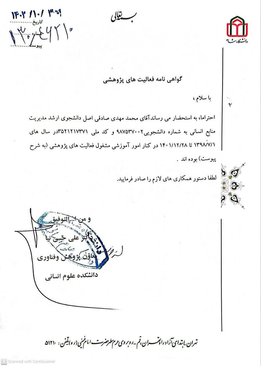 از طرف معاونت محترم پژوهش و فناوری دانشکده علوم انسانی فعالیت آموزشی و پژوهشی با نظارت استاد راهنما به بنده محول شد.